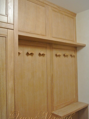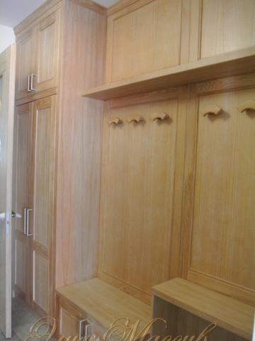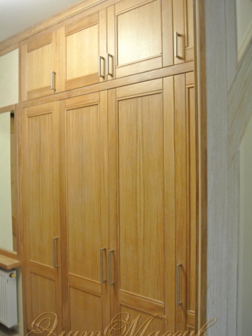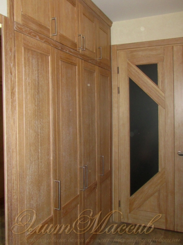 Гардеробные, состоящие из двух конструкций, смонтированы напротив друг друга из массива дуба в патине. Одна часть конструкции более лёгкого плана для верхней одежды и обуви. Вторая часть конструкции полноценная гардеробная на четыре створки и четыре створки под антресоли с внутренним наполнением.