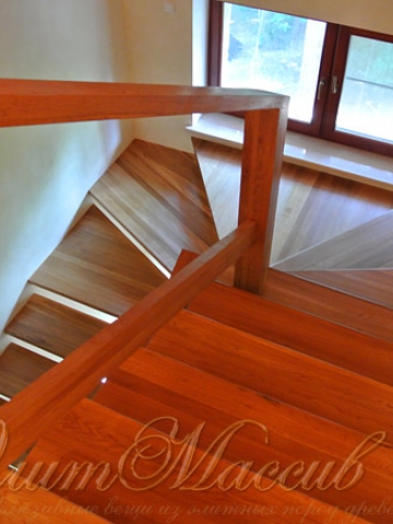 Стандартные ступени, подступёнки имеют обычную форму. Поручни показаны в виде бруса с небольшой балюстрадой с перекрестием на втором этаже.