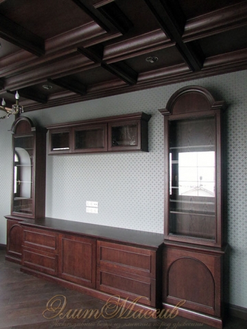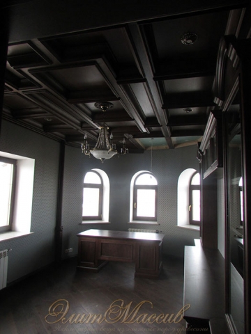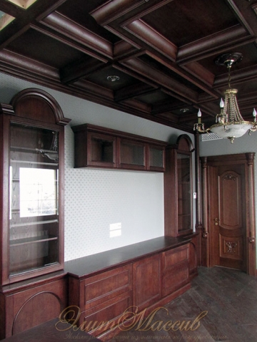 Кессонный потолок выполнен в виде мощной глубокой раскладки филёнчатой формы, уходящий радиусом к окнам. Стенка для книг выполнена в классическом варианте, строго по требованию заказчика, функционально удобная для работы. Стол классический из массива дуба. Двери повторяют дизайн остальных дверей на объекте. Полотно с наплывом, короб с уплотнителем, наличники радиусные двусоставные телескопические, карниз и розетоны. Данная модель кабинета, потолка, дверей и стола могут быть выполнены из массива ольхи, ясеня, бука и дуба в любом варианте крашения и в любом дизайне от заказчика или разработан нашей компанией.