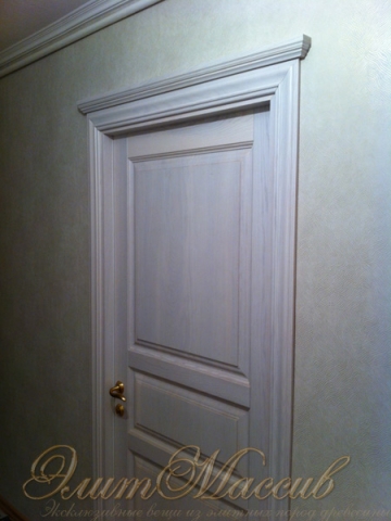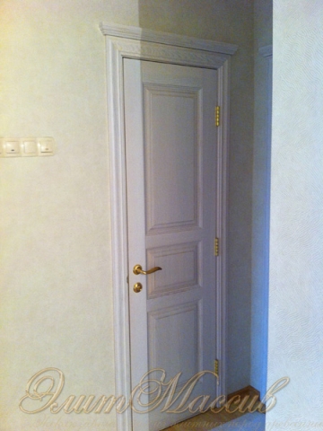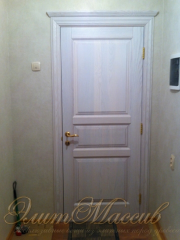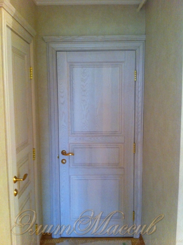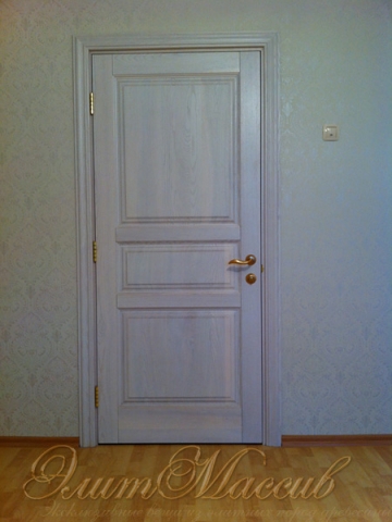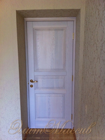 Данная модель представляет собой классическую межкомнатную одностворчатую дверь на три филёнки, выполненную из массива выбеленного дуба. Данный заказ производился и был смонтирован заказчику в г. Москве, по ул. Севастопольский проспект. Требование заказчика было выкрасить в белый цвет дверь так, чтобы сохранилась текстура древесины. Помимо этого по всей поверхности полотна и элементов была втёрта белая патина. При монтаже были сложности в том, что со стороны комнат не везде хватало места для установки полноценных наличником, т.к. стена примыкала практически вплотную к проёму.