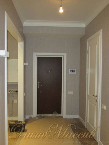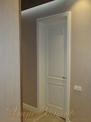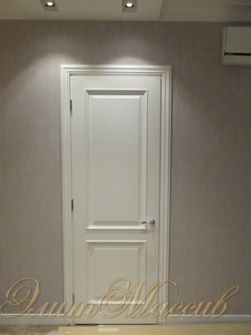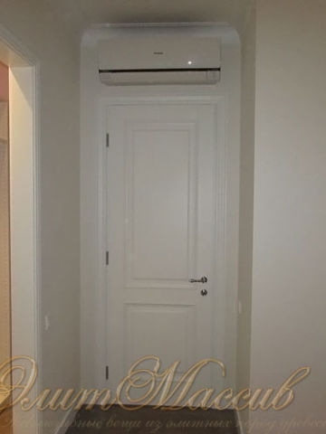 Классические межкомнатные двери стандартного размера из массива ольхи белого цвета поставлялись и монтировались для заказчика на Чертановскую улицу. Наша задача состояла в том, чтобы смонтировать не только двери, но и зашивку проёма без дверей, обрамление входной двери наличником и добором, оформление одной из межкомнатных дверей для установки в верхней фрамужной части кондиционера.