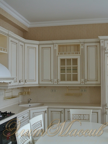 Кухня выполнена из массива бука в белом цвете. Фасады по кухне выполнены из 100% массива бука. Внутреннее наполнение, боковые стенки из МДФ, фонированным шпоном бука и выкрашены в цвет фасадов. Комплектация кухни состоит их верхней части ящиков с глухими фасадами и остеклёнными, вытяжкой с декоративными элементами, соединительными элементами, в виде фрезерованных наличников патинированных и розетонов, карниза, который расположен по всей верхней части кухни, рабочий шкаф по высоте. Нижняя рабочая зона состоит из глухих фасадов, повторяющие верхние.