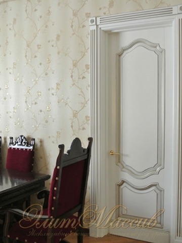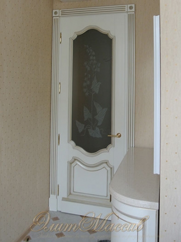 Двери на кухню выполнены в классическом стиле на две филёнки, верхняя под остекление из массива ольхи в белом (светлом) цвете, канелюровыми наличниками, розетонами и подпяточниками.