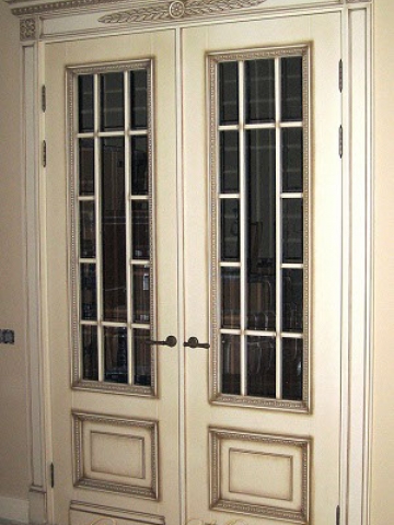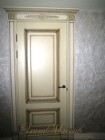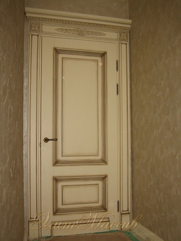 На данный объект поставлялись межкомнатные двойные и одиночные распашные двери из массива ольхи. Двери имеют классический стиль на две филёнки. Два двойных блока выполнены под остекление верхней филёнки в рамке и глухой нижней. Две одностворчатые двери—обе филёнки глухие. В комплект межкомнатных дверей входят сами полотна с наплывом, стекло фацет, наличники телескопические, декоративная фризовая панель с элементами резьбы, розетоны, подпяточники, карниз.