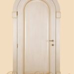 Межкомнатная арочная дверь из массива белого цвета со сплошной по вертикали радиусной филёнкой, коробом и наличниками.