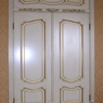 Дверной блок из массива белого цвета, патинированный бронзовой патиной состоит из двух полотен с изящными филёнками неправильной формы, мощной фризовой панелью с декоративными элементами из резьбы и разной формы филёнками, фрезерованными наличниками, карнизом, розетонами и подпяточниками. Полотна с наплывом, короб с уплотнителем, наличники телескопические.