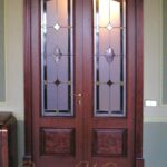 Дверной блок состоит двух полотен, верхние филёнки у которых полуарочного типа под плёночный витраж с элементами фацета.